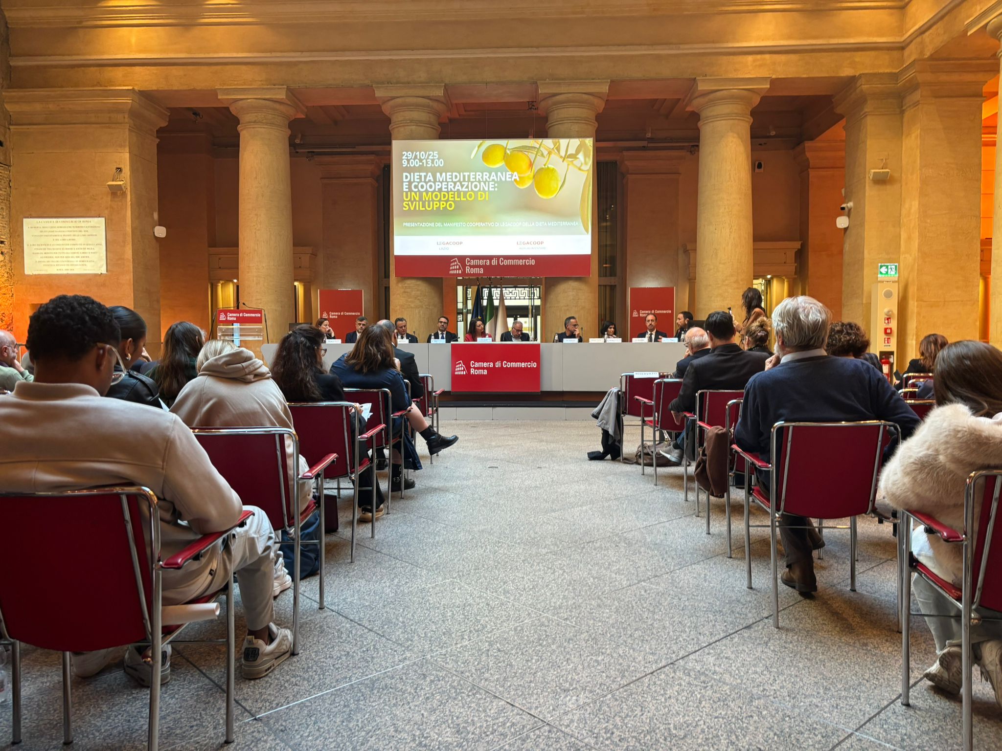 ROMA, 29 ottobre 2025 - Trasformare un patrimonio culturale e alimentare riconosciuto nel mondo in un progetto concreto di sviluppo sostenibile. E' la sfida lanciata oggi nella Sala del Tempio di Vibia Sabina e Adriano della Camera di Commercio di Roma, dove Legacoop Agroalimentare e Legacoop Lazio hanno riunito istituzioni, esperti, mondo agricolo, scuola e imprese cooperative alla tavola rotonda "Dieta Mediterranea e Cooperazione: un modello di sviluppo".